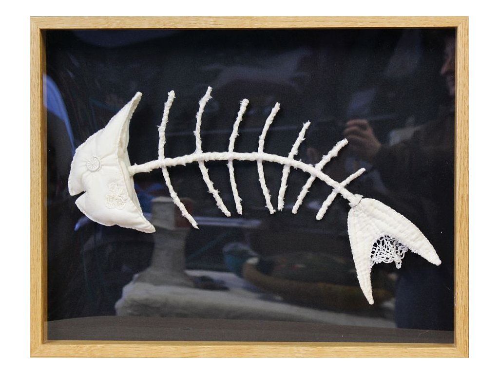 Rybka je ušitá z bavlny a zdobená kousky starožitné krajky a starými nitěnými knoflíky. Kostra má drátěnou konstrukci, takže dobře drží tvar.