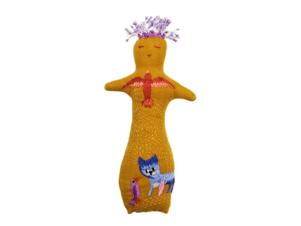 Archeologické artefakty ze starých dob mě inspirovaly k drobným vyšívaným panenkám totemového tvaru. Tvary těla kopírují obrysy vykopávkových nálezů, tělo mají pokryté dekorem, který jsem vyšívala z volné ruky a nechala se vést samotným tvarem.
