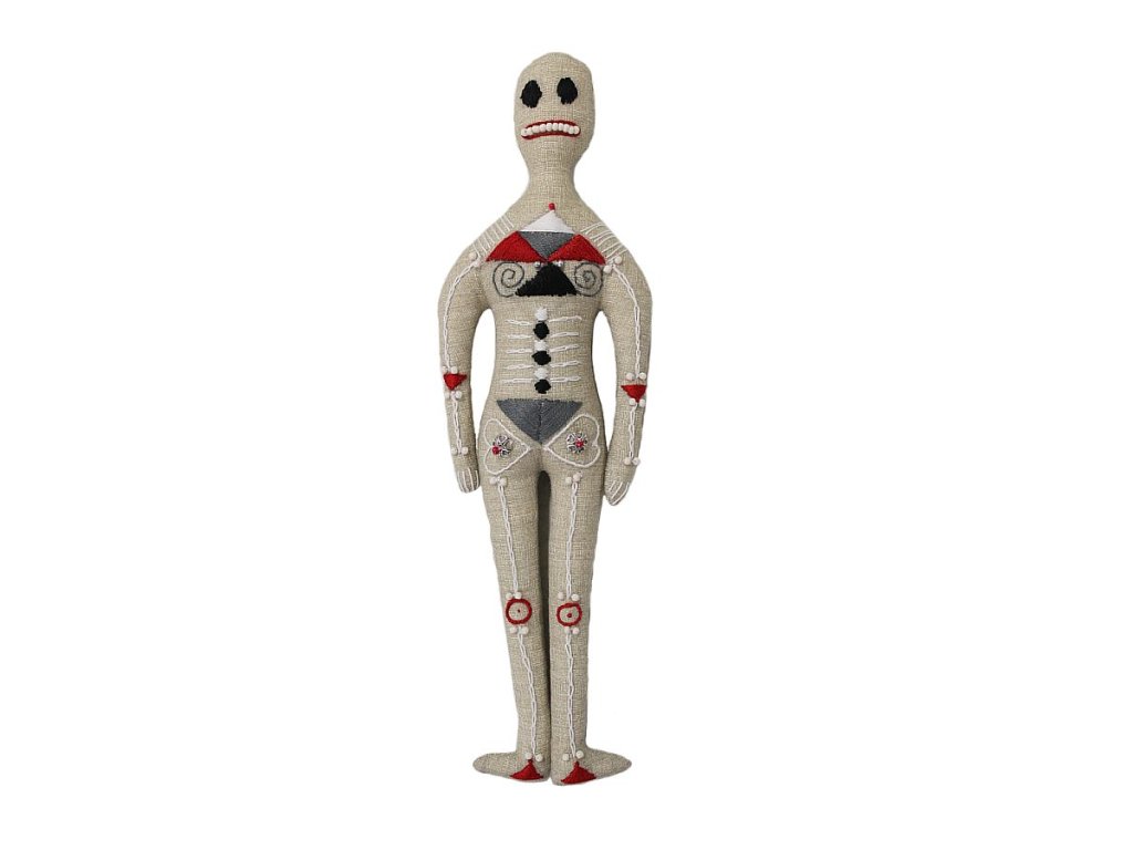 Můj vyšívaný Jidáš je drobnou variantou na tyto velkolepé ďábelské postavy. Má na těle bavlnkami vyšitý motiv kostry, je měkce plněný dutým vláknem a lze ho v případě ušpinění opatrně vyprat v teplé ruční lázni.