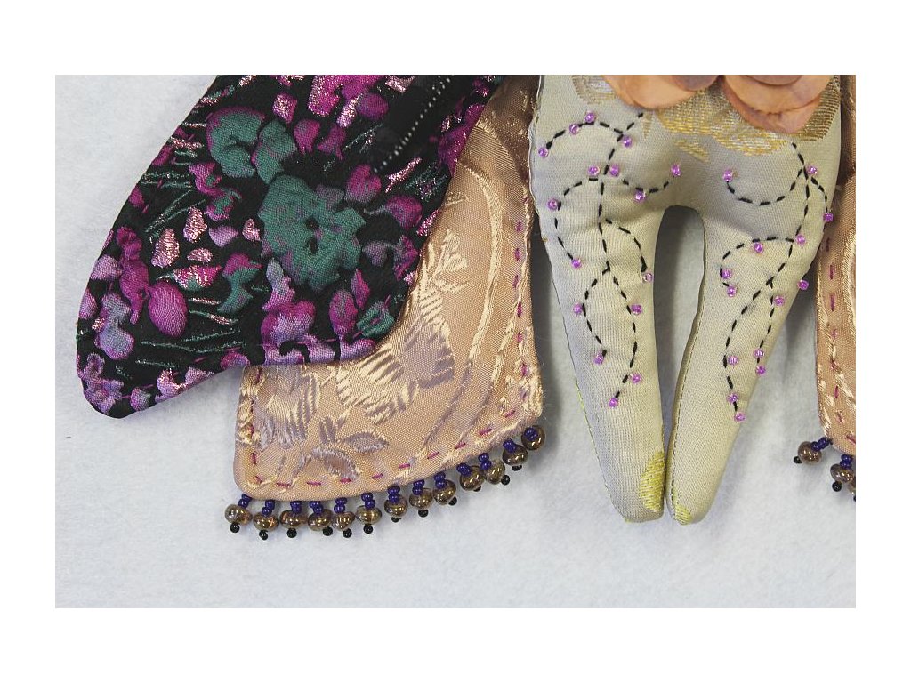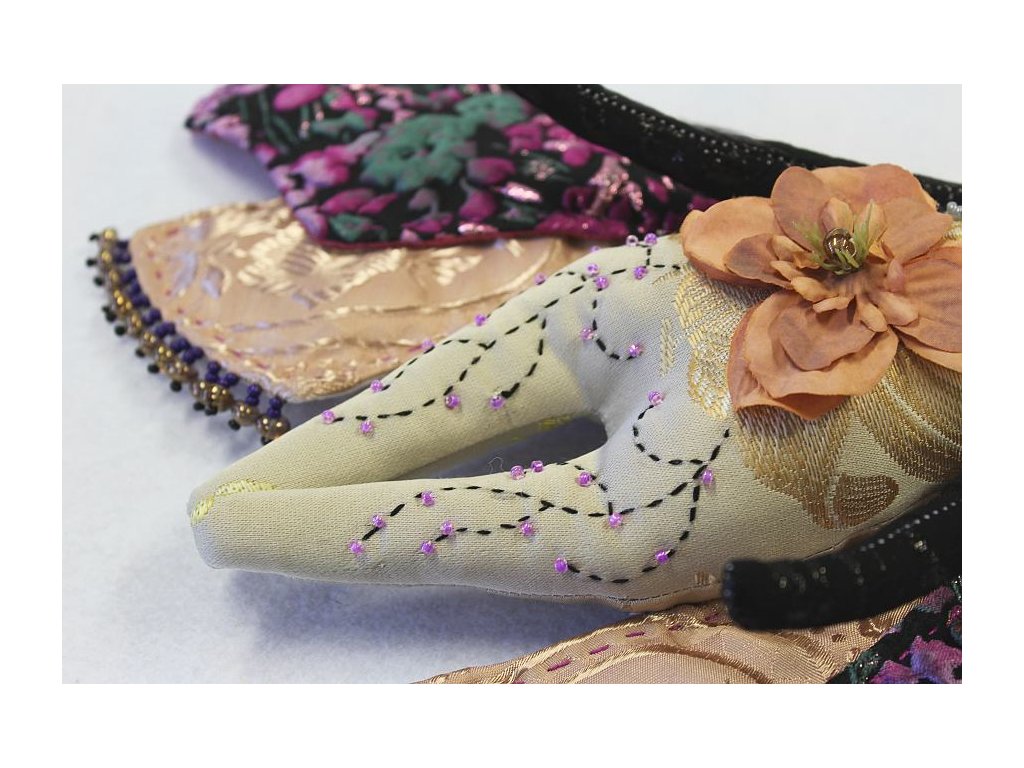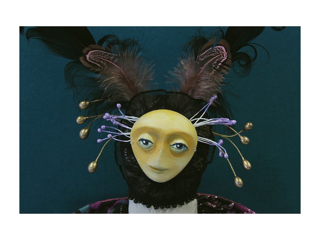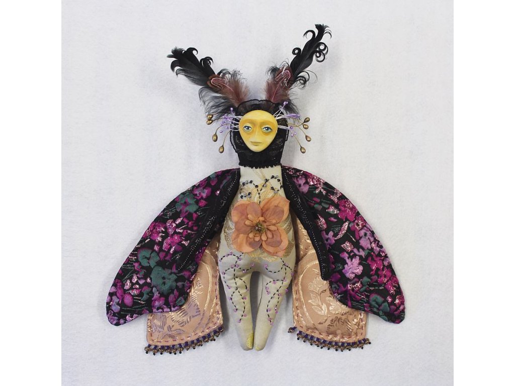 Můrka je ušitá z krásných tkanin s protkávanými zlatými nitkami a měkce plněná dutým vláknem. Hlavička je vymodelovaná z paperclay, umělecké panenkářské hlíny, pomalované a povrchově zafixované lakem. Zdobená je starožitnými krajkami a peříčky.