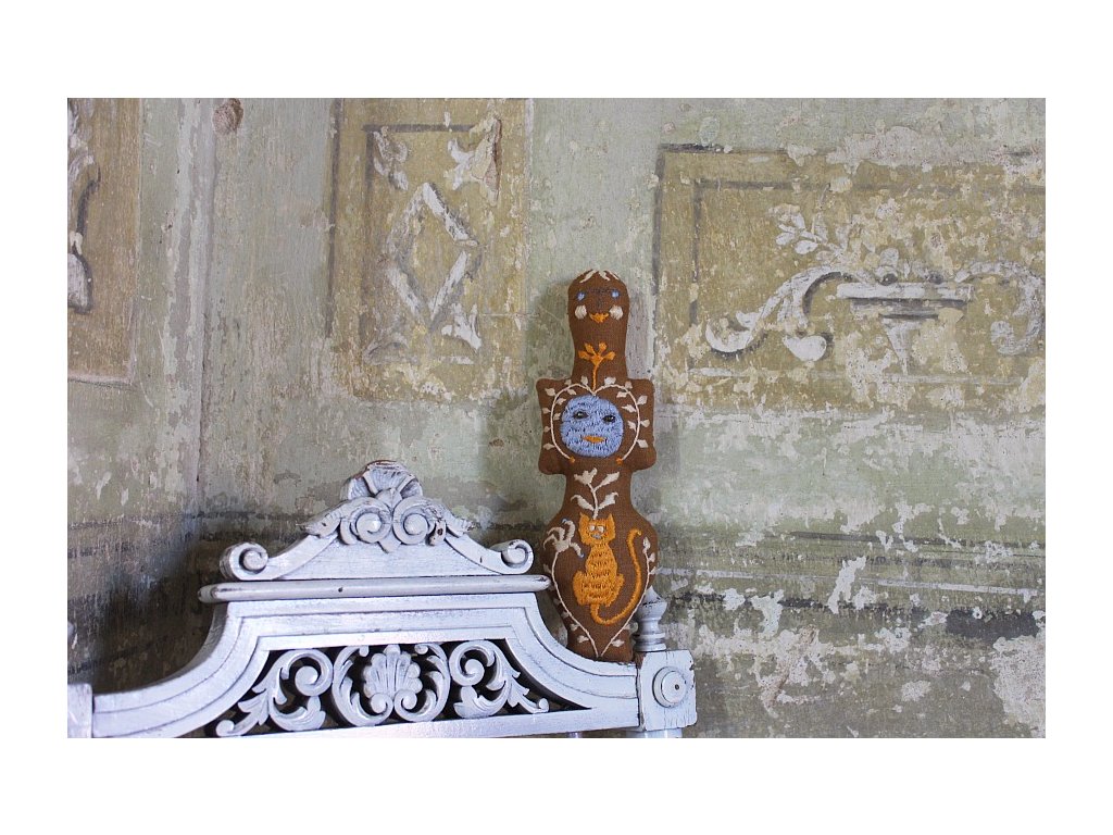 Archeologické artefakty ze starých dob mě inspirovaly k drobným vyšívaným panenkám totemového tvaru. Tvary těla kopírují obrysy vykopávkových nálezů, tělo mají pokryté dekorem, který jsem vyšívala z volné ruky a nechala se vést samotným tvarem.