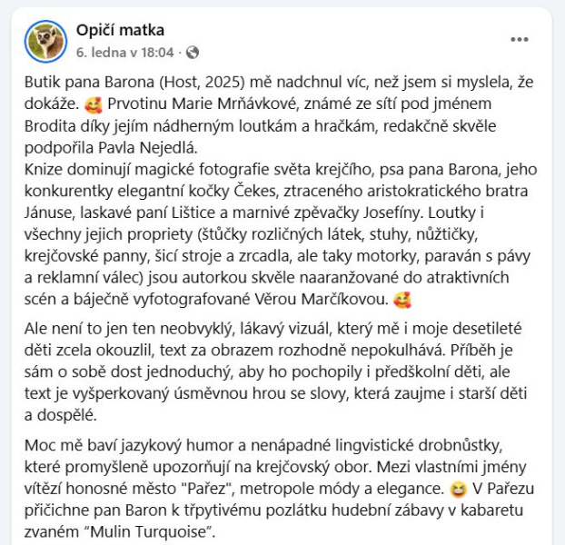 Ale samozřejmě mám pak obrovskou radost, když čtu recenze, ze kterých sálá upřímné potěšení nad knihou. Prostě jo, je to krásný pocit, že moje práce i velké úsilí redakce se protnulo se stranou čtenářstva.