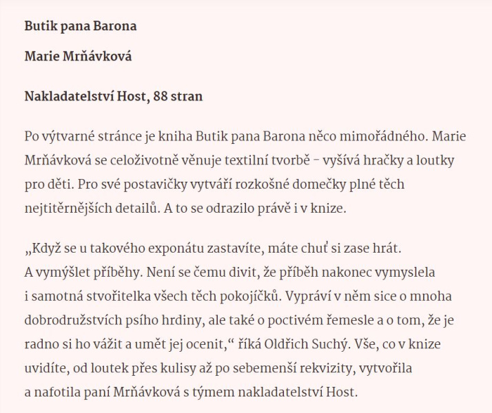 A protože napsat knihu a vyrobit k němu loutky a spoustu rekvizit je časově a potažmu finančně náročné, grant by mi pomohl v práci pokračovat rychleji. Na čem nyní pracuji je vidět níže. A proto si vás dovolím poprosit o hlas. Stačí kliknout na odkaz níže, vyhledat v seznamu nominovaných titulů knížku Butik pana Barona a poslat mu hlas. Nic víc není třeba, žádná registrace ani potvrzovací email. A když budete šířit tento odkaz dále mezi své přátele, pomůže mi to dvojnásob.
