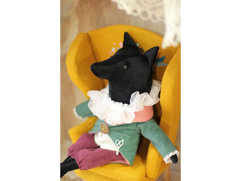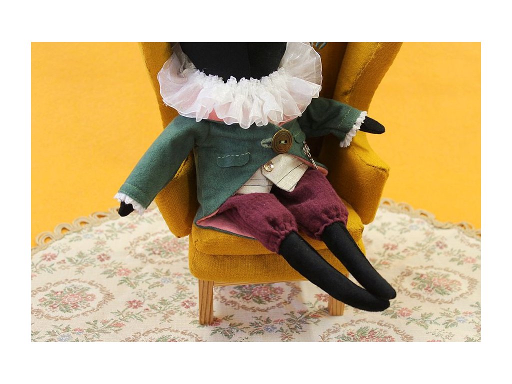 Oblečky jsou svlékací a pratelné. Pejsek je ušitý z černého sametu a měkce plněný dutým vláknem. Frak a vesta jsou podšité a dají se svlékat. Nákrčník z řasené tylové krajky je na gumičku a lze ji pohodlně sundat. Kalhoty z mušelínu jsou také na gumičku a můžete je pohodlně svléknout. Vše lze podle potřeby vyprat - doporučuji ruční lázeň, neždímat kroucením. Oblečky lze přežehlit.