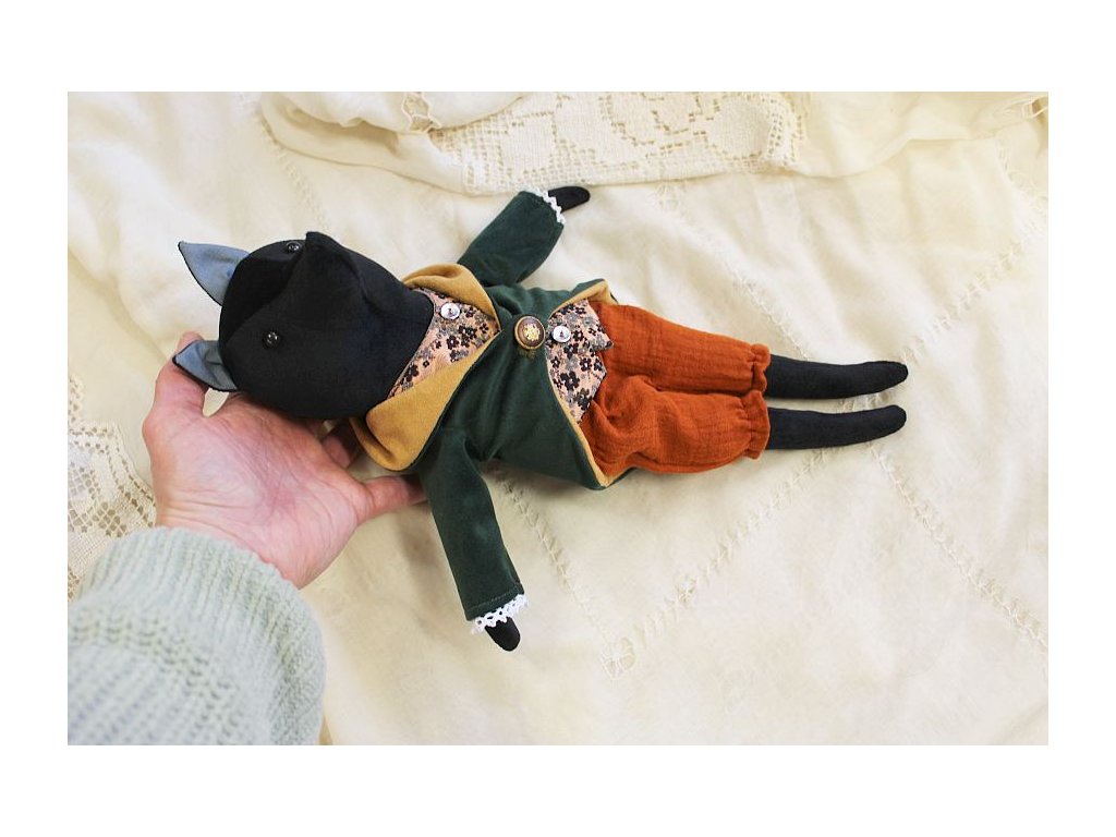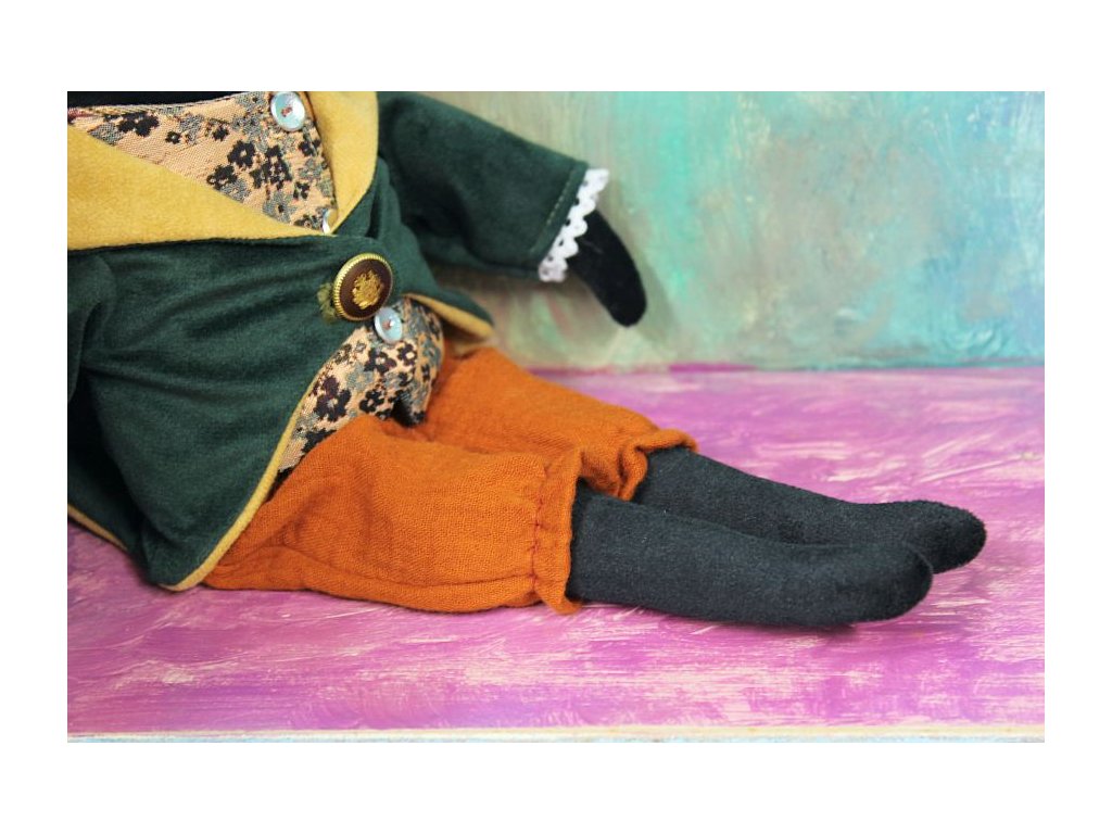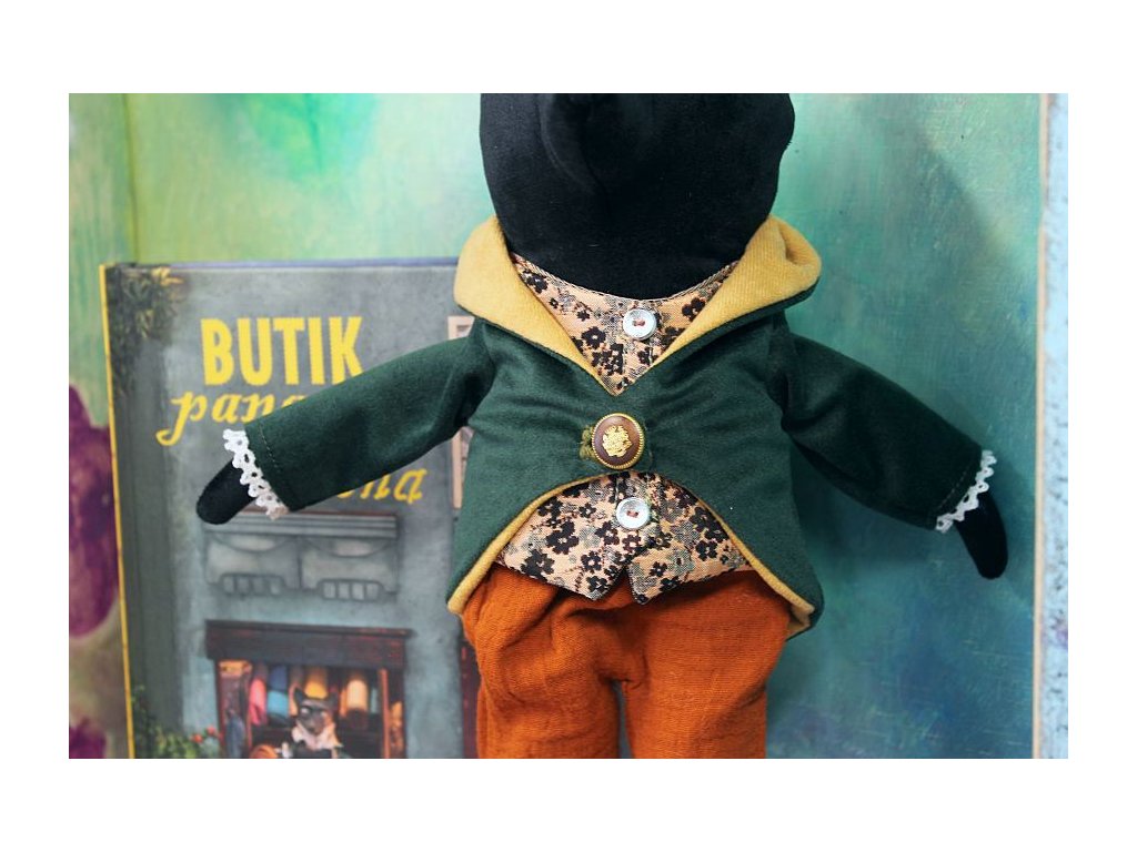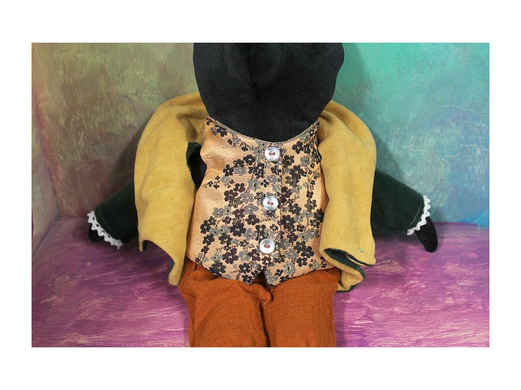 Oblečky jsou svlékací a pratelné. Pejsek je ušitý z černého sametu a měkce plněný dutým vláknem. Frak a vesta jsou podšité a dají se svlékat. Kalhoty z mušelínu jsou na gumičku a můžete je pohodlně svléknout. Vše lze podle potřeby vyprat - doporučuji ruční lázeň, neždímat kroucením. Oblečky lze přežehlit.