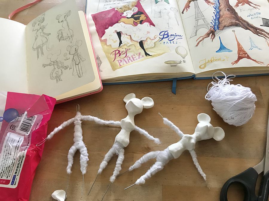 Malé nahlédnutí do procesu. Opět drátěná kostra, obalená rounem a tentokrát jsem paperclay nanesla přímo na tělo. Hlavičky ostatních loutek jsou modelované zvlášť a dají se tak otáčet ve své ose. To u těchto myšek není potřeba.