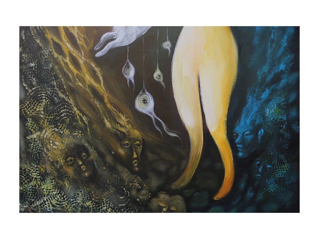 Akryl na plátně, pevný dřevěný blintrám, 50 x 70 cm. Nerámováno. Signováno.