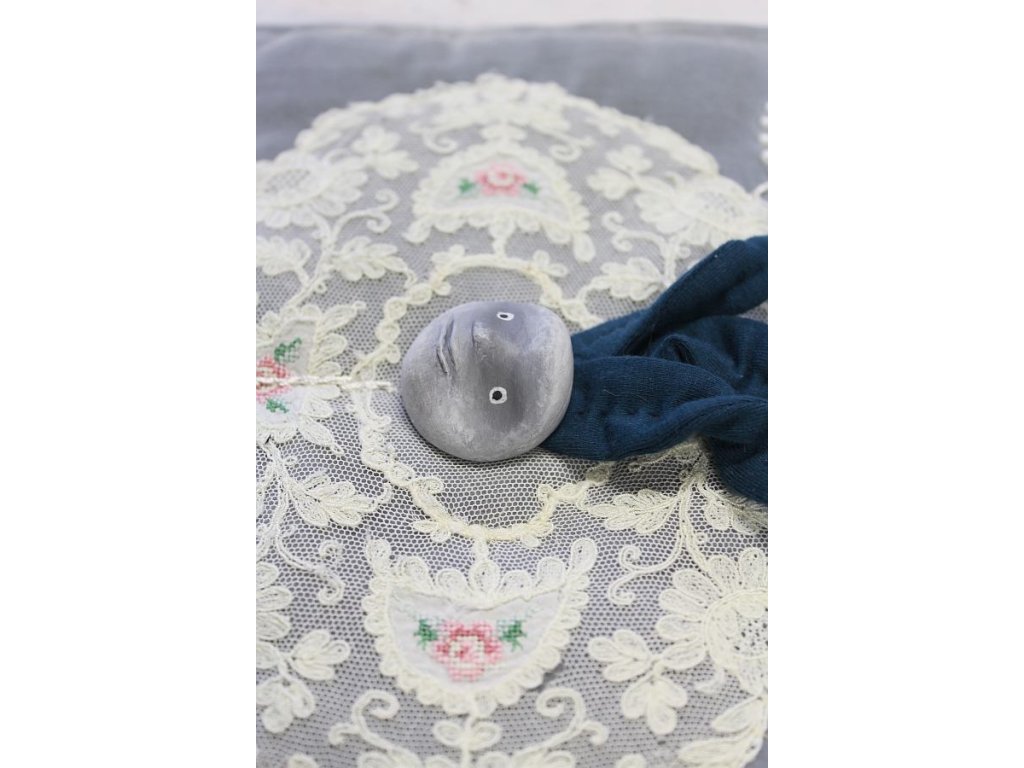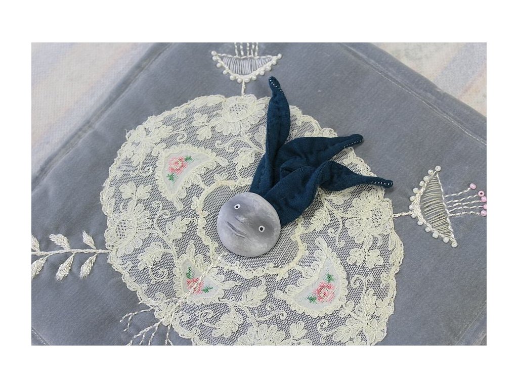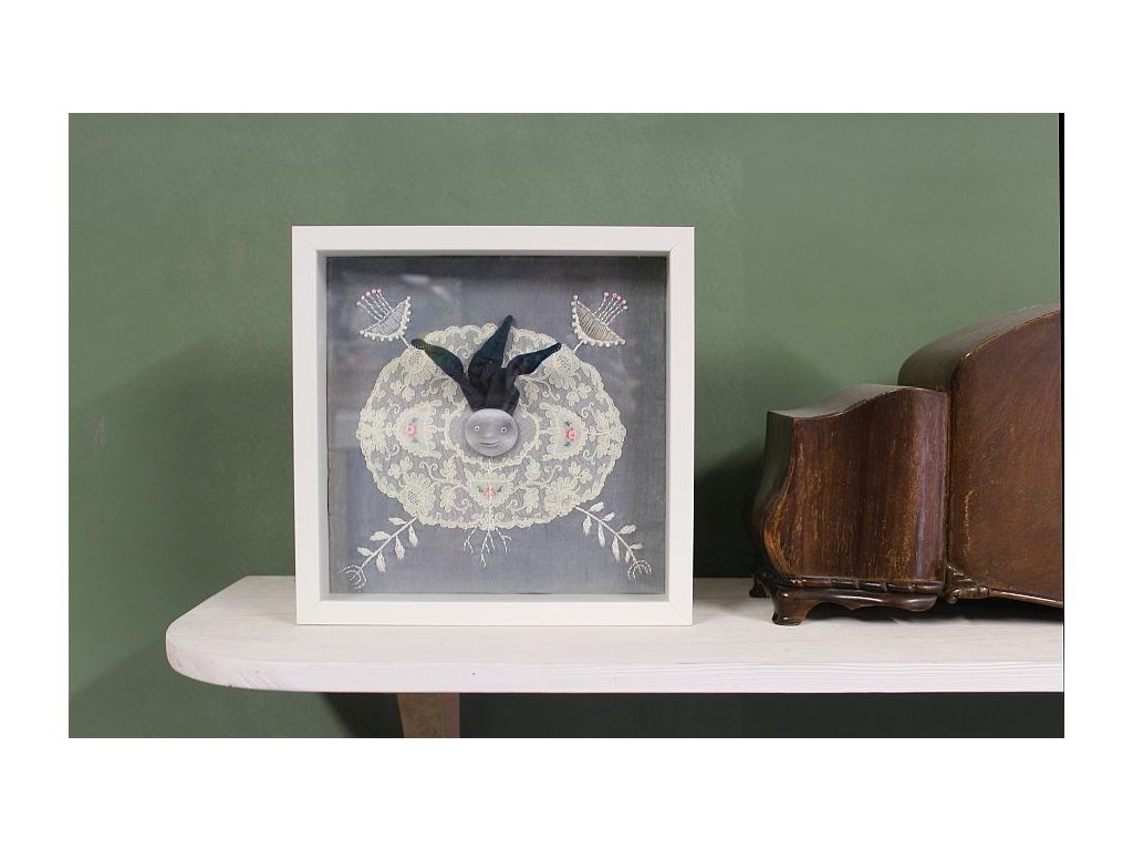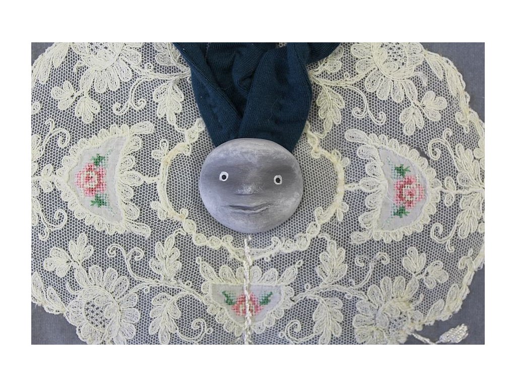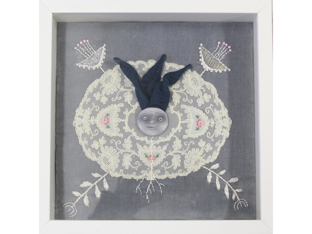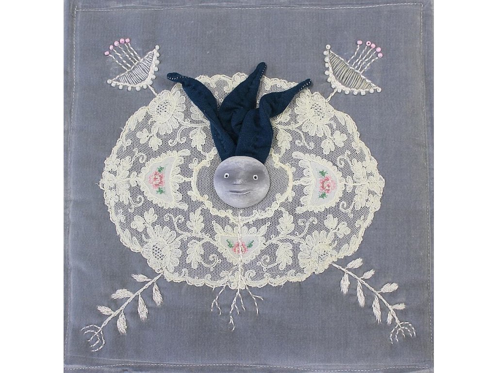 Motiv mandragory parafrázuje barokní andělíčky s buclatými tvářemi a ratolestmi. Vyšito na šedém sametu bílou bavlnkou. Výrazným motivem je středová starožitná krajka s ručně vyšívanými růžičkami.