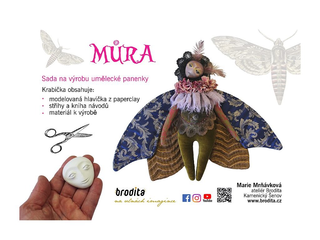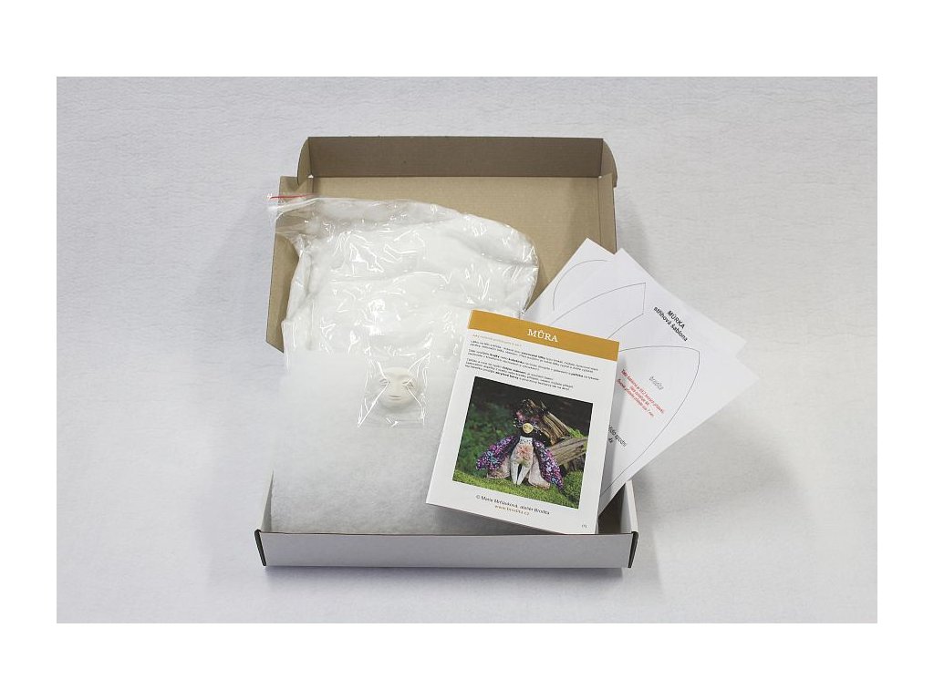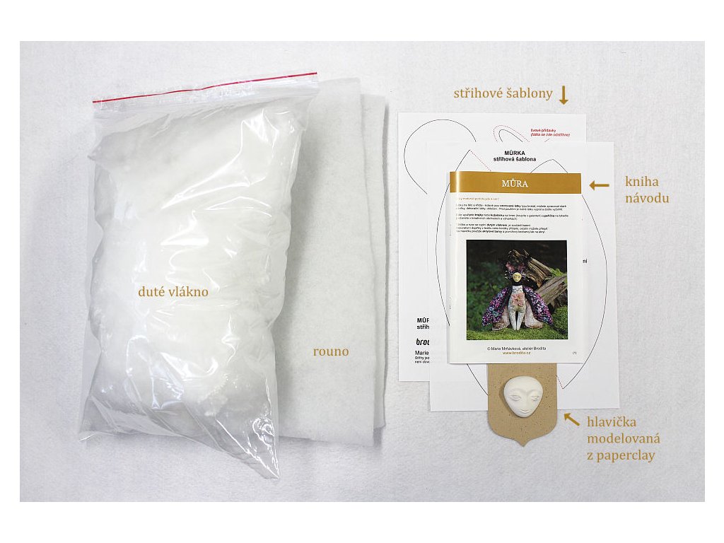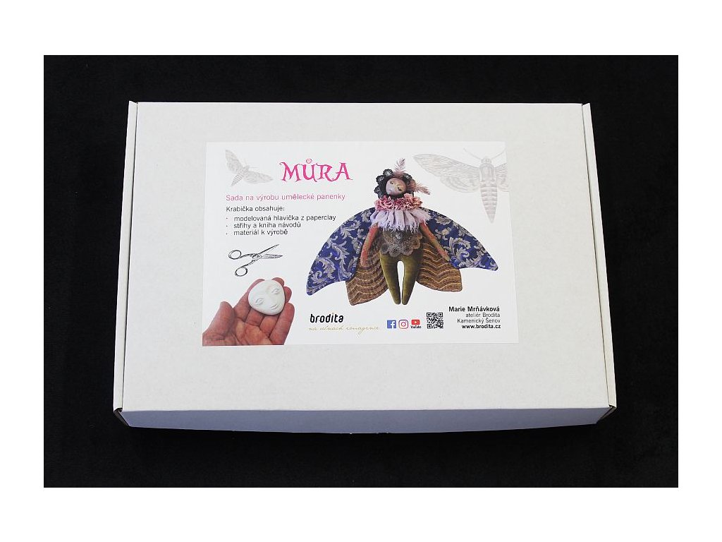 Zvláštností této sady je hotová hlavička z kvalitní hmoty zvané paperclay od japonského výrobce. Hlavička není ODLÉVANÁ ze sádry, ale pracně MODELOVANÁ a ručně dobrušovaná Odtud se odvíjí cena za celou sadu. Pokud byste si chtěli můrku ušít pod mým vedením, můžete na celodenním workshopu v hodnotě 2500,-Kč, který párkrát do roka otevírám ve svém Kabinetu kuriozit.