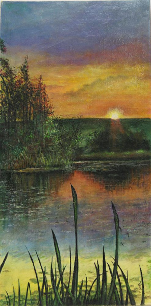Stmívání u rybníka / 30,5x60,5cm / olejomalba na desce, 2025 / 2000,-Kč