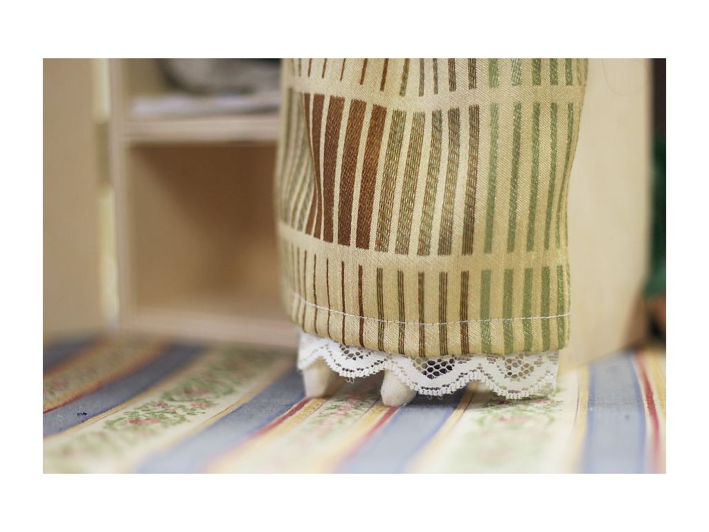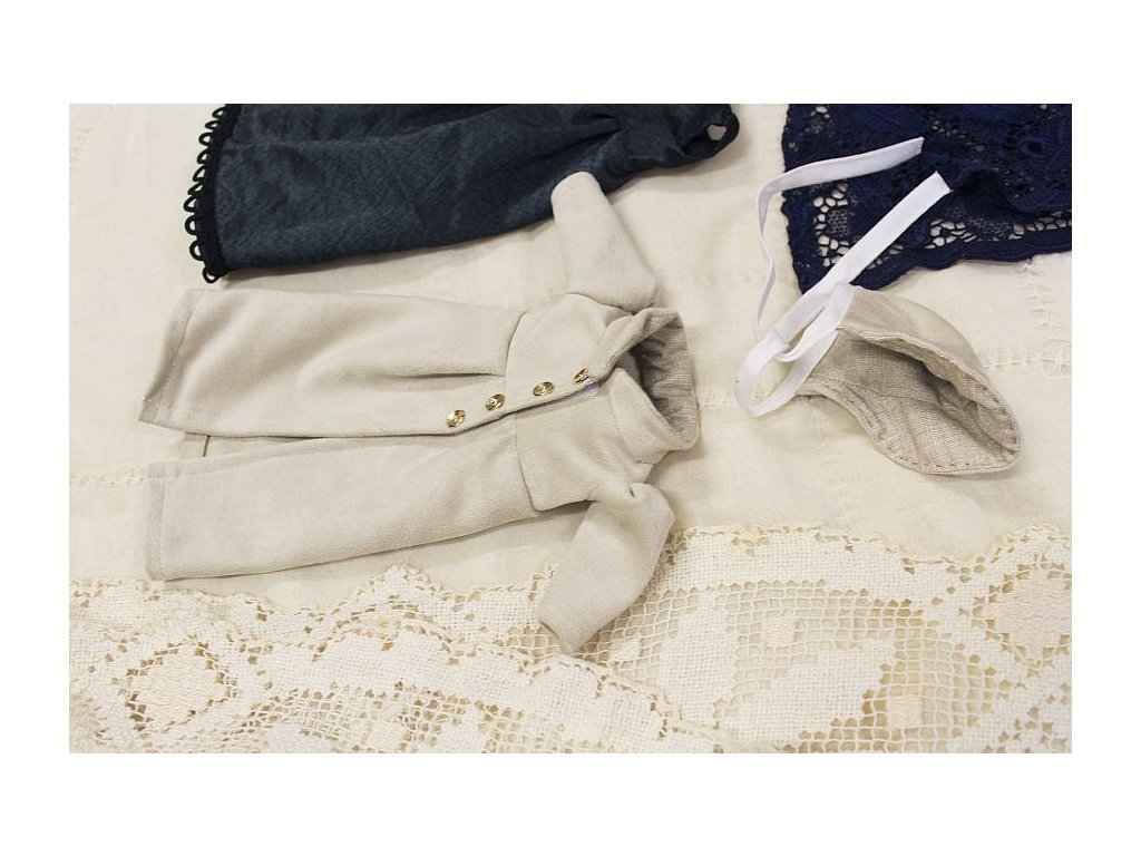 Materiál: Panenka z plátna 100% bavlna a výplně duté vlákno, vlásky jsou z polyesteru, kabátek a čepec z krémového měkoučkého semiše, šaty ze saténu. Spodnička a plášť jsou z krajky.