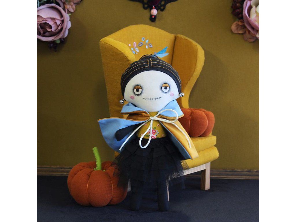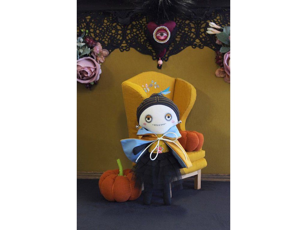 Monsterka má oboustranný plášť - z jedné strany je sametově žlutý, z druhé modrý. Uvazuje se na saténovou šňůrku.