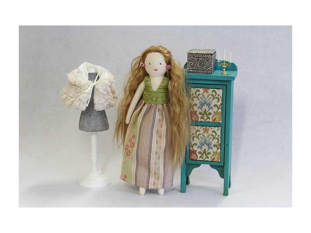 Materiál: tělo 100% bavlna, výplň duté vlákno, oblečky z různých textilií (satén, umělý kožíšek, bavlna, polyester, viskóza).