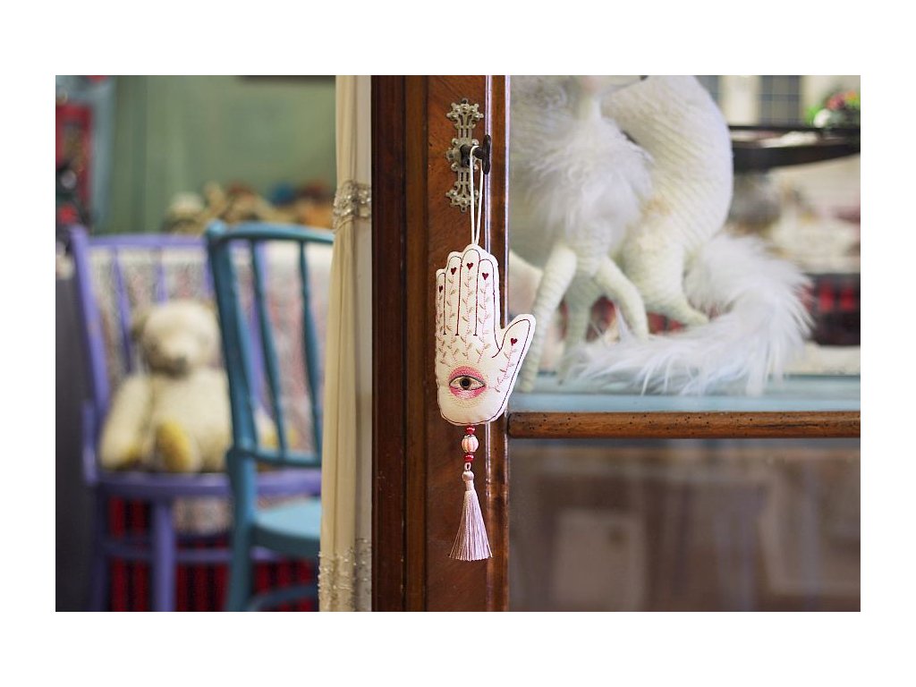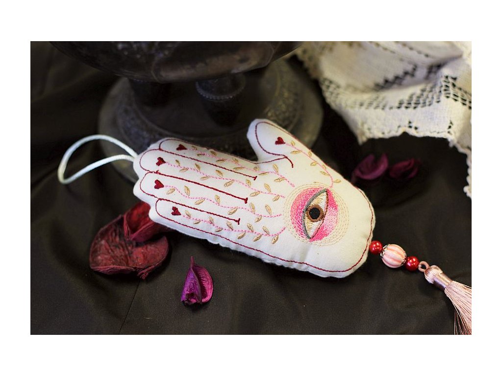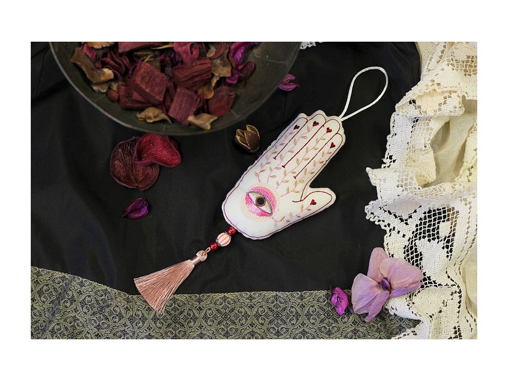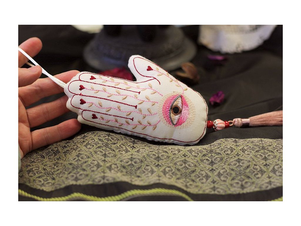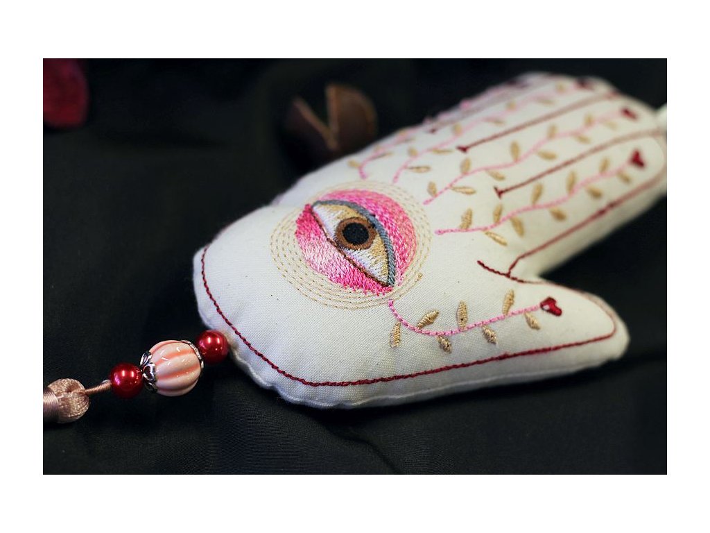 Bohatě vyšívaná hamsa je ušitá ze 100% bavlny, měkce plněná dutým vláknem. Na spodní části je doplněná 2 skleněnými korálky a jedním výrazným porcelánovým, dozdobená krásným střapcem.