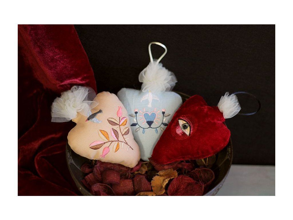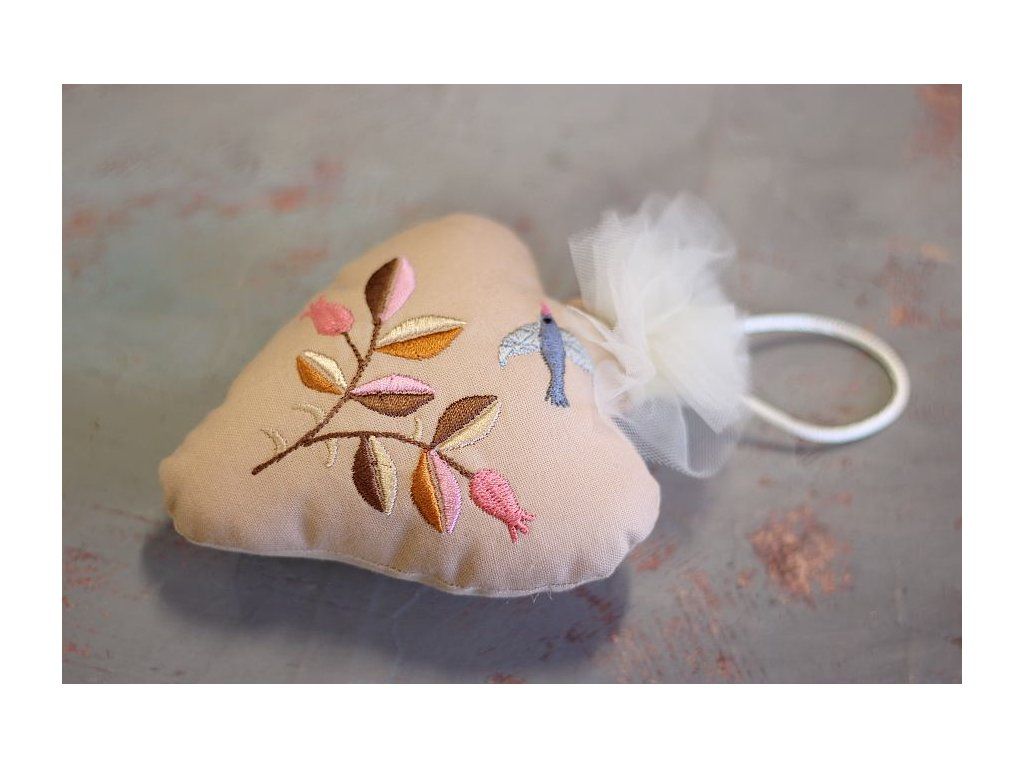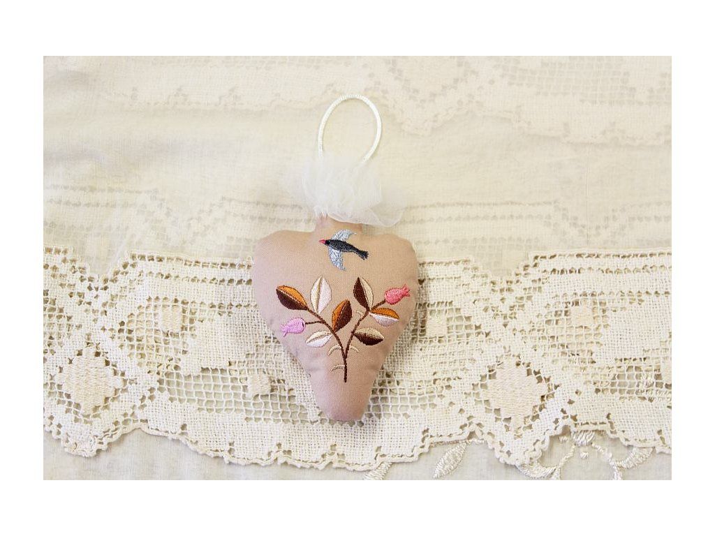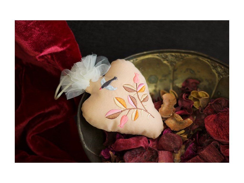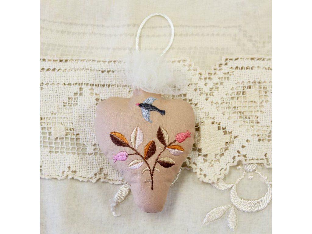 Toto srdíčko je vyšité na bavlněném plátně okrové barvy, tylová krajka představuje plamen. Strojová výšivka představuje větvičku v podzimních barvách.