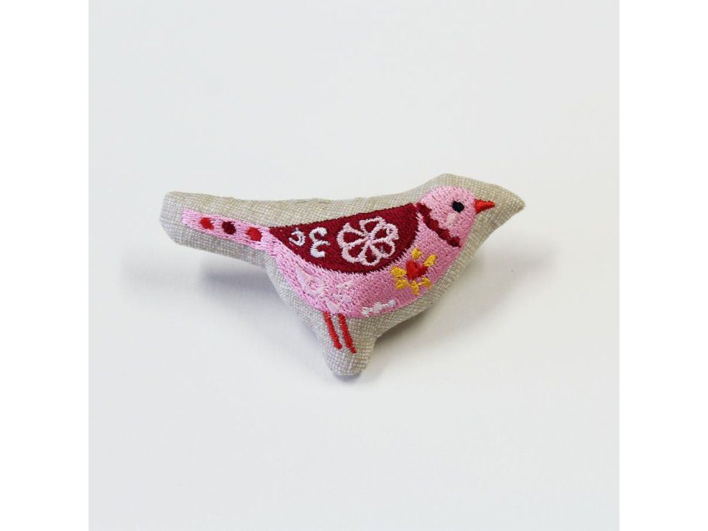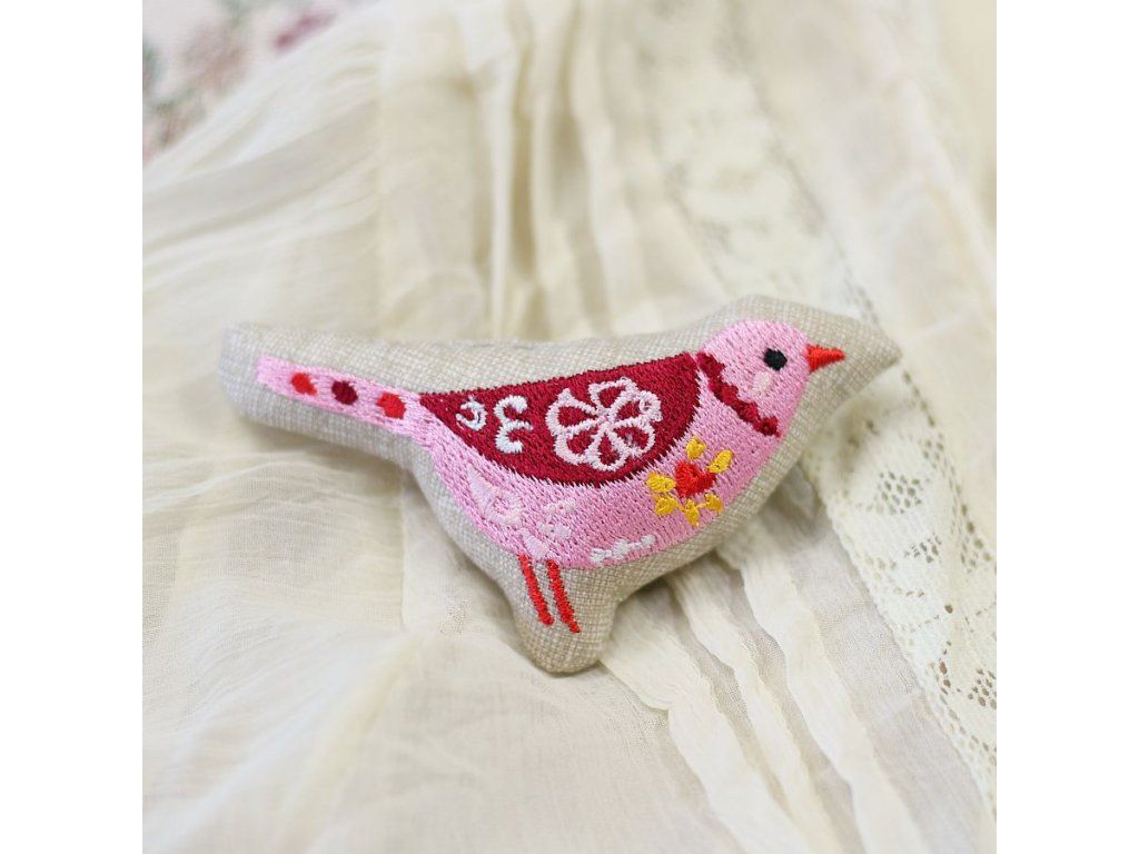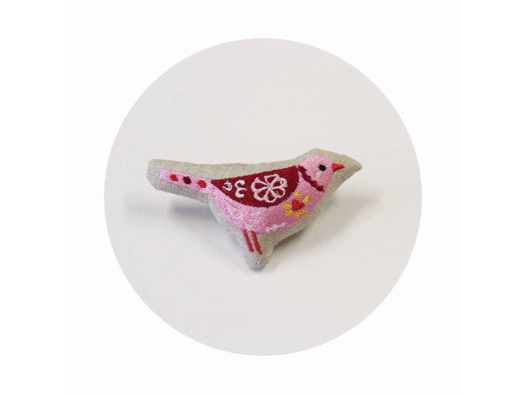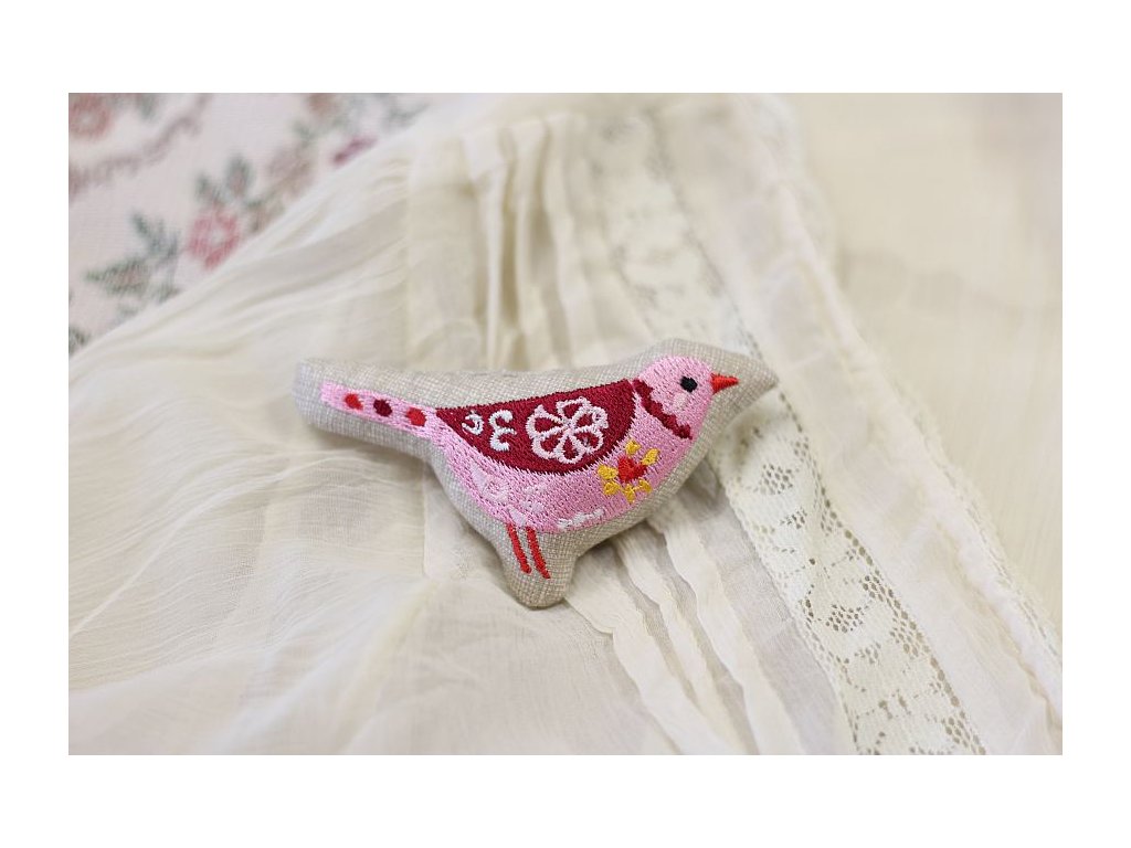 Brož je vyšitá na lněném korpusu o rozměru cca 10x6 cm a měkce plněná dutým vláknem.