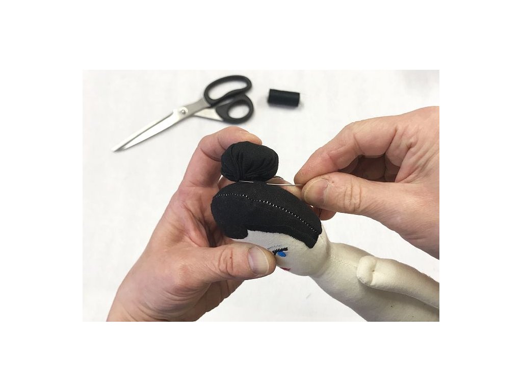 Látku na tělo (37x50 cm), látku na vlasy (12x16 cm). Na výplň panenky duté vlákno.